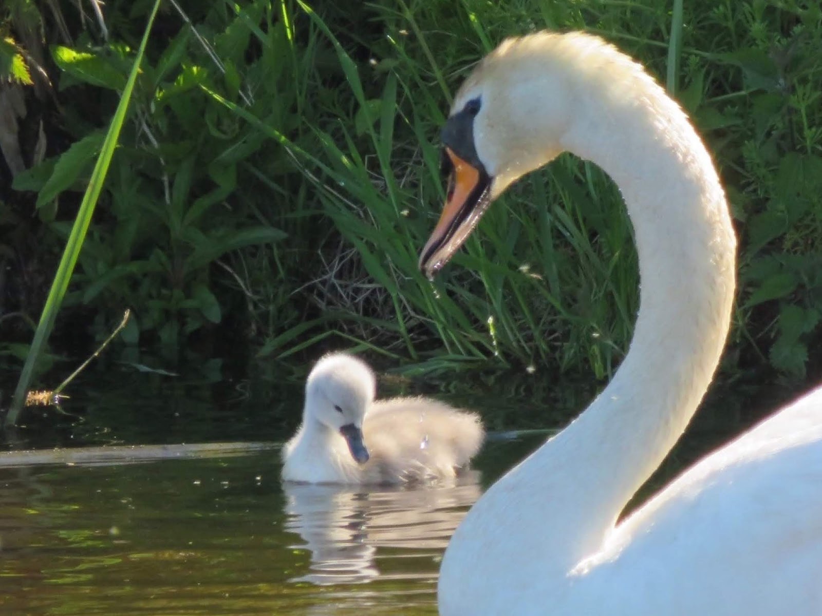 Vandaag was het prachtig weer... weer... want wat worden we al weken verwend door de zon... Vanavond heb ik de tuin al gesproeid... het is zo droog...  de scheuren zitten in de grond van het gazon... Moeder Zwaan is na 5 weken eindelijk klaar met broeden... het leverde 7 kuikenkinderen op...  Vanmorgen dobberde de hele familie zwaan voorbij... Ondanks dat moeder zwaan het druk had met eten... wat tijdens de broedtijd er nog wel eens bij in schiet.. hield ze haar kroost goed in de gaten... Ook papa zwaan was heel beschermend... die vaarde voor het zwanenconvooi uit... om iedereen te waarschuwen dat zijn familie eraan kwam... Hij had nog net geen zwaailicht op zijn kop...  maar blazen deed hij wel... Op mijn foto moeder zwaan met één van haar koters... Hier straalt alleen maar moederliefde van uit...